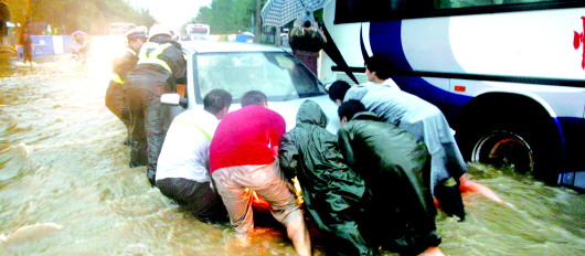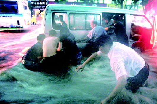 原本宽阔的历山路俨然成为一条大河,湍急的水流没过了膝盖,冲得路人站立不稳、行走困难。记者张庆村和高红日走到和平路时发现一辆轿车被困,立即和交警对其进行救助,结果张庆村在推车时受了伤。