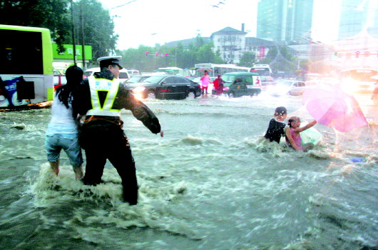 交警在暴雨中救助被冲倒的行人。