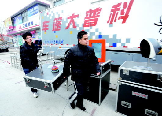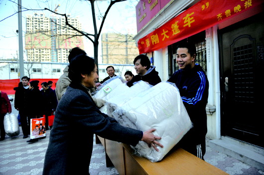 张刚大篷车为困难居民送棉被。本报记者 徐延春 摄