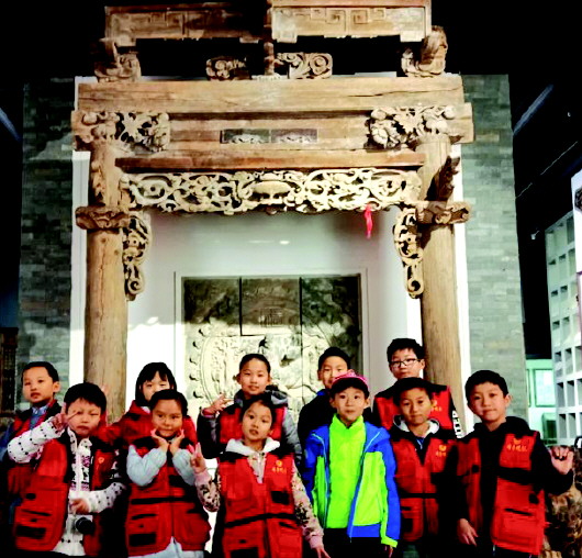在博物馆二楼的民俗展馆,入口处雕刻精美的门楼和有福禄寿寓意的砖雕让大家惊叹。木匠用的墨斗、卖货郎曾使用过的拨浪鼓、祭祖用的器具、睡觉用的瓷枕、染布用的工具和流程……整个展馆向小记者们展示了一个先辈们陌生而新奇的生活状态。