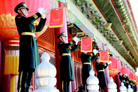 每月第一天升国旗增加号手和礼兵的迎旗环节。新创作《升旗号角》音乐,由军乐团8名礼号手在天安门城楼演奏,象征奏响新时代的奋进强音。