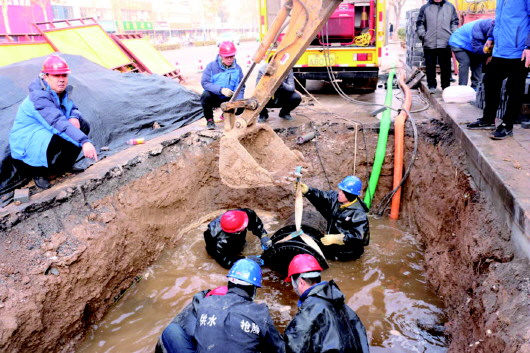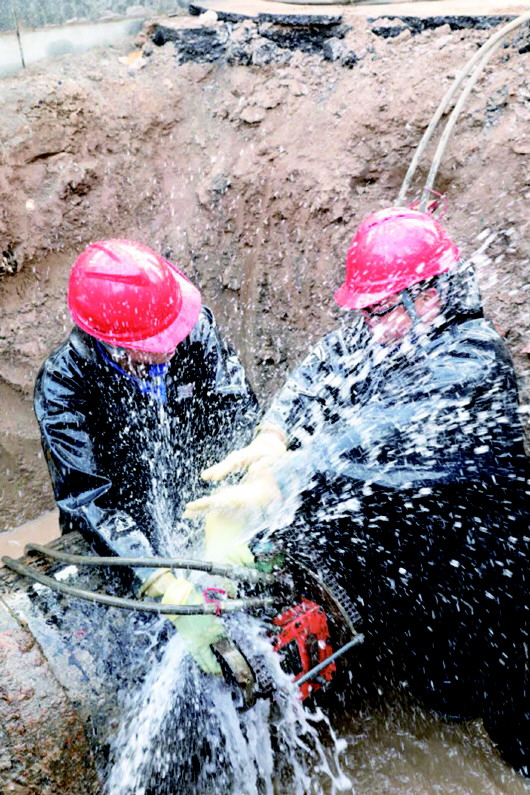 尽管已经关闭了管道阀门,但管道内的存水在巨大的压力下依旧向外喷射,飞溅的水流瞬间从头到脚淋湿了每个人。此时,顶着凛冽的寒风,浑身湿透了的抢修队员邱松、房义智、付云龙,在工作坑内刺骨的积水中对受损管道进行紧张切割。
