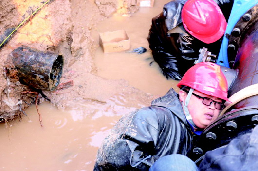 为提高抢修速度,进行断管操作时,抢修人员利用两台扒刀两边同时作业,一派紧张而繁忙的景象。最引人关注的是头戴安全帽身穿加绒雨裤的“80后”小伙房义智,虽然手套可以阻止冰水刺激,但戴上手套干活不灵活,他干脆就把手套摘掉,赤手握住冰凉的铁扳手,一个接一个地上螺丝。不大一会儿,身体已被周围的泥水包裹,为了能使上劲,他的脸几乎贴到了冰凉的管道上。