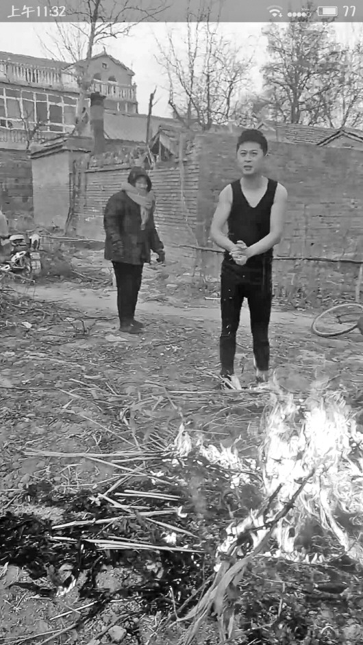 乡村医生秦占英下水救人后烤火取暖。村民供图