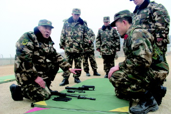 武警济宁支队支队长徐守新(左一)向新兵讲解组装枪支要领。