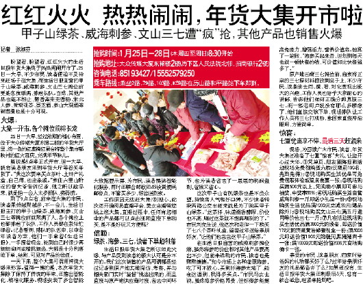 盼望着,盼望着,红红火火的生活日报年货大集终于热热闹闹开市了。25日一大早,不少市民、读者便迫不及待来赶场子逛大集,而生活日报主营的甲子山绿茶、威海刺参、文山三七摊位前更是客流爆满,排起长队。当然,其他产品也毫不相让,馨香斋莱芜香肠、东北人参、茉莉花茶、景芝酒、泰山大观酒等销售量也是十分可观。