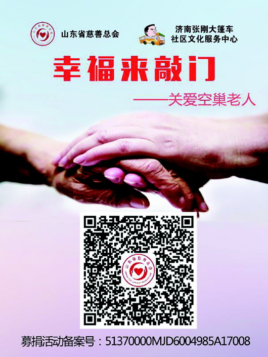 关爱空巢老人,关爱我们的老父母,也就是关爱未来的自己。齐鲁晚报张刚大篷车联合山东省慈善总会启动的“幸福来敲门”关爱空巢老人大型公益活动,就是希望通过丰富的活动、优质的服务以及精神慰藉,帮助空巢老人解决生活上的困难,为他们带去温暖和快乐。