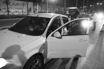 酒驾查处现场,交警对过往机动车驾驶员进行酒精吹气检测。