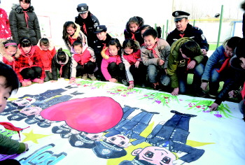 近日,定陶区公安局黄店派出所民警来到辖区牛楼小区,学校的留守儿童们向其展示自己制作的“感恩”年画,以感谢警察叔叔、阿姨们一年来对他们在学习、思想及生活上的关爱和帮助。
