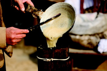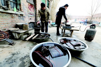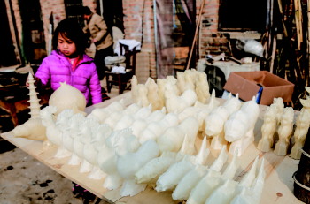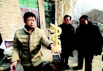 1月31日,金乡县鸡黍镇马集村,刘玉彬正带着儿媳妇制作糖供。按照3:1的比例,将白糖和水兑在一起,然后放入铝制锅内熬制,高温下白糖开始融化为糖稀。刘玉彬一边叮嘱儿媳不停搅动,一边将已经泡制好的模具从水中捞起放在平摊的桌面上。15分钟过后,刘玉彬将熬制好的白糖迅速倒入特制模具内,并匀速旋转模具,3分钟后,一个精致的糖制“盘龙柱”出现在齐鲁晚报·齐鲁壹点记者面前。