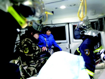 10时49分许,一切准备妥当。消防官兵用救援担架把老丛抬上海军卫生队的救护车,火速载至码头登上舰艇。舰艇顶着风浪全速驶往市区,约11时许,舰艇靠岸,老丛随即被转移至早已在码头守候的救护车上,拉至四〇四医院。