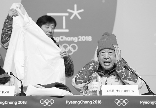 ◥平昌冬奥组委会主席李熙范(右一)在发布会上展示开幕式用防寒用品。 新华社发