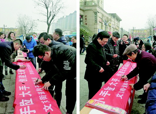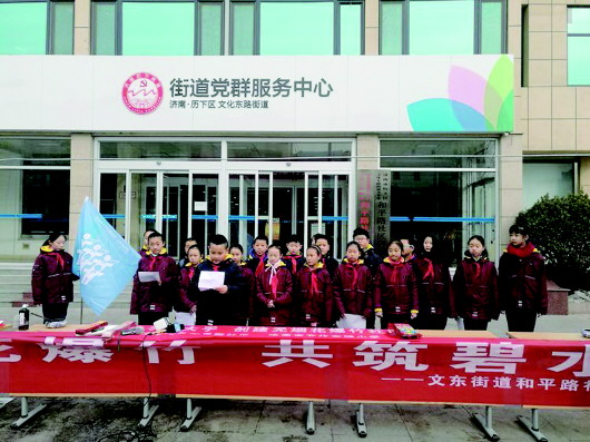 文东小学“红领巾”文明小使者宣传燃放烟花爆竹危害、倡导大家文明过年,自觉做抵制烟花爆竹的践行者。活动吸引了很多路过的市民,大家在禁燃宣传条幅上签字。