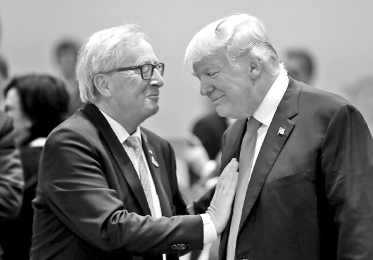 欧盟委员会主席容克与美国总统特朗普去年在G20峰会上会晤的照片。