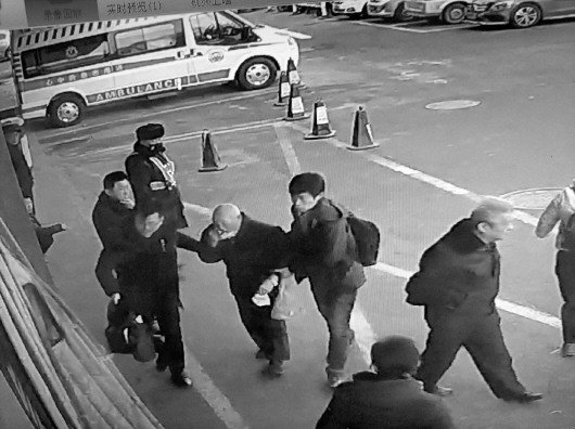 两位男子搀扶起张振荣,把他送往医院急诊室。 (视频截图)