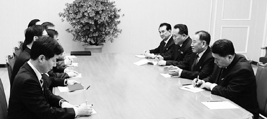 5日下午,在朝鲜平壤,青瓦台国家安保室室长郑义溶率领的韩国总统特使团(左排)与朝鲜劳动党中央委员会副委员长金英哲一行交谈。