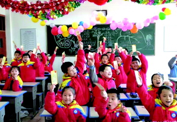 日照凤凰小学的同学们展示写有新一年目标的“春之计”书签。
