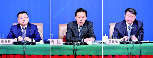 财政部部长肖捷,副部长史耀斌、胡静林围绕“财税工作和财政改革”回答中外记者提问。 新华社发