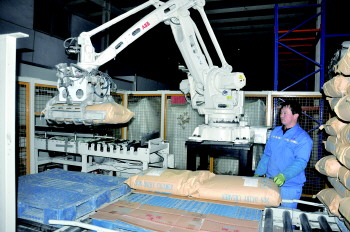 在大树集团一加工车间,齐鲁晚报记者看到,偌大的车间操作的工人却很少,在仓库内,一台机器人正在“工作”,只见它“手臂”下摆,抓住货箱,抬起,再放到货车上,一个完整的动作不过几秒钟,不仅节约了大量人力,效率也是翻倍。
