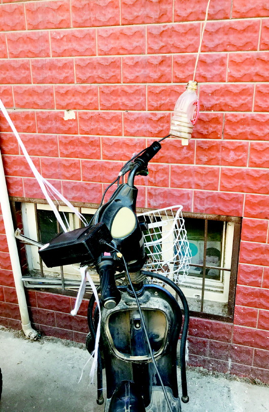 至于一些老旧小区,多没有电梯,业主就把电动车直接堆在一楼楼道附近。由于不能带上楼,这些业主更是发明了省事的充电方法。