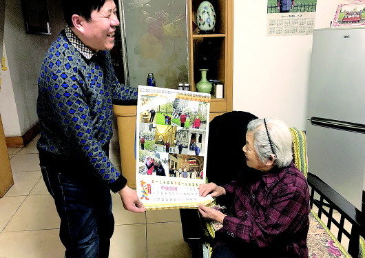 今年55岁的李明与母亲翻看着用旅游照做成的挂历。 本报记者 陈玮 摄