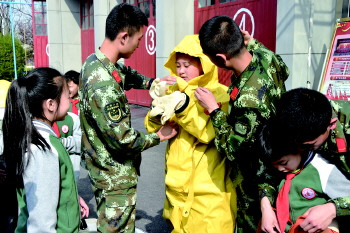 消防官兵帮助学生穿上消防服装。
