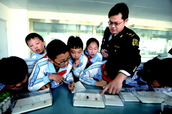 在检验检疫工作人员的引导下,金海岸小学师生走进动植物检疫实验室、标本室参观,观看国门生物安全图片展,并听取工作人员对国门生物安全知识、检验检疫法律法规的讲解。