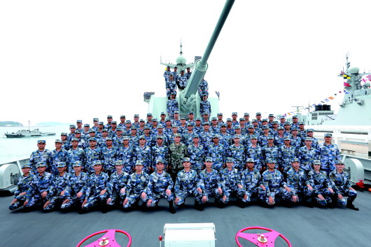 4月12日,习近平出席南海海域海上阅兵,同长沙舰部分官兵合影。 新华社发
