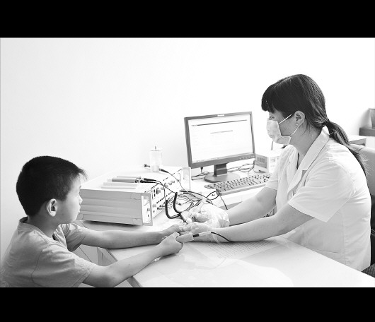 医务人员帮小患者测试过敏原。