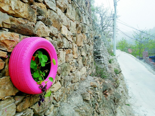 苇沟村里,到处都能看到这种用一块钱一个的废旧轮胎改造的“花盆”,现代轮胎与古老墙壁结合出了特有的味道。 本报记者 刘雅菲 摄
