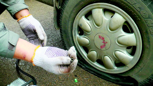 不过,他们在检查轮胎时却没有发现其有被扎的痕迹,但当拧开气门芯的防尘帽时,队员们却看到每个防尘帽里面都有一粒小石子。队员拒绝泠漠表示,防尘帽里放上小石子拧上后,轮胎会自动放气,从外面还真看不出来。一位车主看到后也表示,这放气的太专业了。