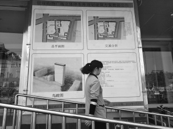 25日,位于太白楼路上的银座购物广场的进出处,贴着商场立体停车库规划建筑方案批前公告。从公布中停车场的鸟瞰图及基本内容可以看出,这个停车场是独立的智慧立体停车楼。