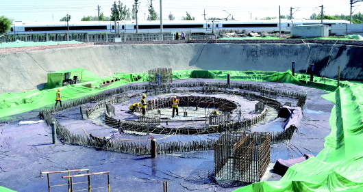 5月3日22时36分,转体斜拉桥下转盘浇筑完成。4日,记者在现场看到,每过几分钟便有高铁在其旁驶过。 本报记者 刘飞跃 摄