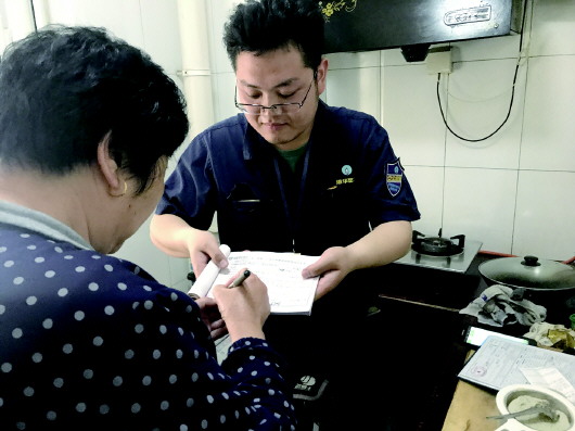 港华燃气安检员入户检查,用户签字确认。 本报记者 王杰 摄