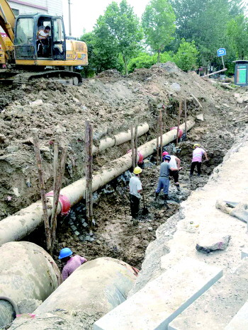 施工人员正在维修被挖断的自来水管道。 本报记者 赵念东 摄