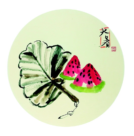 类似的还有“大暑”和“小暑”这两幅画。小暑意指天气开始炎热,但还没到最热,农作物都进入茁壮成长阶段,需要加强管理。小暑也有三候:一候温风至;二候蟋蟀居宇;三候鹰始鸷,于是“小暑”这幅画中透着蟋蟀的生机,叫声仿佛透过画传到耳畔。而大暑正值三伏天里的“中伏”前后,正是一年中最热的时期。“怎么体现酷热呢?”赵俊笑着说,二十四节气和古人的吃穿住行息息相关,那就画与生活相关的事物,一把蒲扇、两片红透的西瓜,足以让人从中嗅出炎炎夏日的味道。