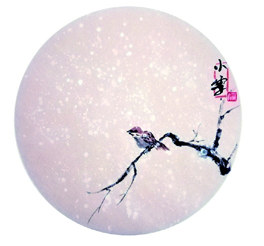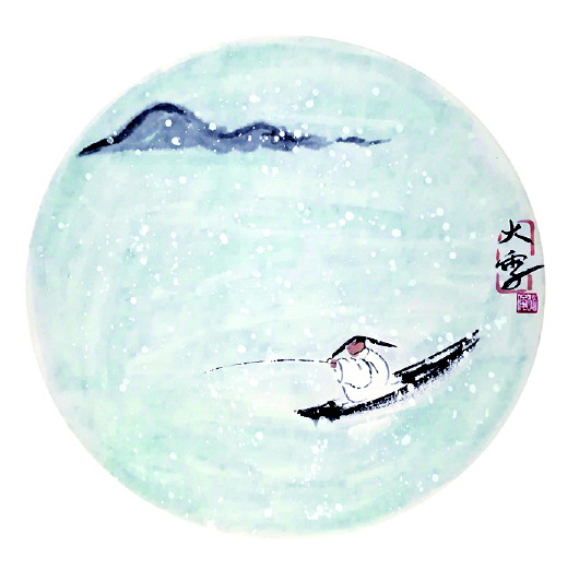 在赵俊看来,把节气和传统的农耕习俗结合起来有些挑战,把相近的节气区分开也并不简单。在构思“小雪”和“大雪”这两幅画时,她开始不知如何区分,后来突然想到“孤舟蓑笠翁,独钓寒江雪”的诗句,这不正是大雪的景象吗?在这两幅画中,“小雪”在初冬,天空刚开始出现稀稀拉拉的雪花,只见一只麻雀独立枝头,而到了“大雪”那幅画,已是万物凋敝,没有生机,画中只有一位老渔翁在江上独自垂钓。