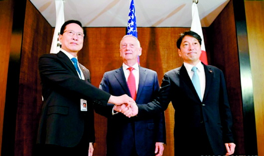 3日,韩国国防部长官宋永武、美国国防部长马蒂斯和日本防卫大臣小野寺五典(从左至右)在新加坡举行会谈。