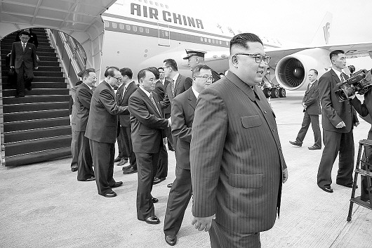 6月10日,朝鲜国务委员会委员长金正恩(前)抵达新加坡樟宜机场。新华社发
