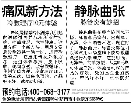静脉曲张长期血液回流不畅,脉管容易瘀积,出现痒、发黑,令人痛苦不堪。现在好了,静脉曲张、脉管炎部位可以试试用迈净堂牌下肢冷敷器具进行冷敷理疗,它费用低、无异味,简单方便。只需5元即可体验三次。体验活动靠的产品的疗效,凭的是企业的良心。产品好不好,试试就知道。