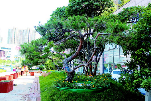舜华南路上新栽植了许多漂亮的盆景树。