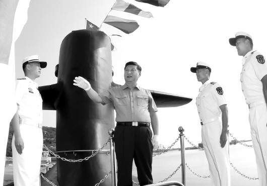 15时30分许,习近平来到某潜艇部队,首先听取了部队建设有关情况介绍。军港码头上,前不久参加过南海海域海上阅兵的某新型潜艇伏波静卧,满旗高悬,艇员们在艇面上分区列队,精神抖擞迎接习近平到来。习近平登上潜艇,走到艇员们中间。习近平一直牵挂着常年奋斗在深海大洋的潜艇兵们,他关切询问官兵的工作生活情况。了解到官兵们爱岗敬业、战风斗浪,圆满完成各项工作时,习近平点头赞许。习近平下舱室、进战位,详细了解武器弹药技战术性能。他勉励官兵们坚定理想信念,建设坚强集体,把打赢本领搞过硬。习近平在潜艇航泊日志上郑重签名。离开码头时,习近平特意走向停泊在附近的另一艘潜艇,向整齐站坡的官兵们挥手致意。