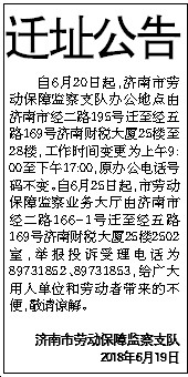迁址公告 自6月20日起,济南市劳动保障监察支队办公地点由济南市经二路195号迁至经五路169号济南财税大厦25楼至28楼,工作时间变更为上午9:00至下午17:00,原办公电话号码不变。自6月25日起,市劳动保障监察业务大厅由济南市经二路166-1号迁至经五路169号济南财税大厦25楼2502室,举报投诉受理电话为89731852、89731853,给广大用人单位和劳动者带来的不便,敬请谅解。 济南市劳动保障监察支队 2018年6月19日