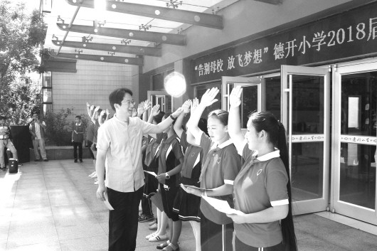 6月28日上午,德开小学“告别母校·放飞梦想”2018届毕业典礼举行,毕业生和老师、家长一起回顾过去、展望未来,为六年小学生涯画上圆满句号。孟杰校长为学生颁发毕业证,并为本届毕业生最后一次整理少先队礼姿势。