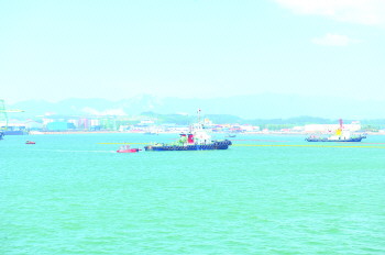 6月28日上午,“2018年威海市海上溢油应急处置演练”在成山头海域举行,9艘船舶、100余人参加。演练模拟一艘散货船与海底不明物发生触碰,燃油舱破损,燃油泄漏。威海市海上溢油事件应急处置指挥中心协调应急力量开展应急交通管制、溢油监视监测、海上溢油围控清除等3个科目演练,图为对溢油围控后回收船开展溢油回收作业。