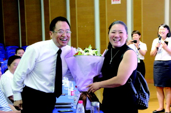 为校长献上鲜花 家长当场为孩子报名入学