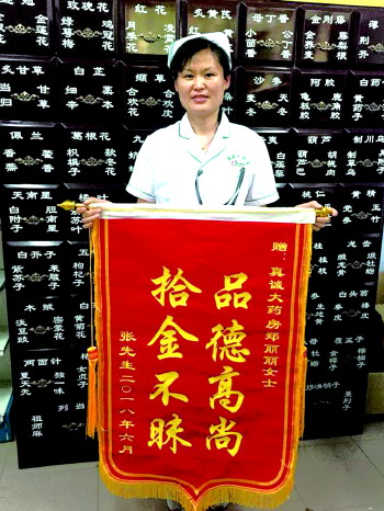 第二天张先生来到药店,带着许多水果,并执意拿出一沓现金作为酬谢,郑丽丽说:“找到您我就放心了,这是我应该做的。”婉拒了他的谢意。令我们没想到的是,6月4日,当这名顾客再次来到药店时,手里拎着的却是一面“拾金不昧,品德高尚”的锦旗……