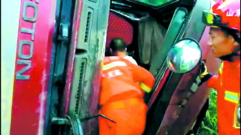 雨天货车侧翻一人被困