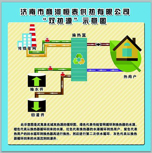 对地热资源的合理利用,给济南热力集团商河恒泰供热有限公司开启“双热源”供热模式奠定了基础。2017年开始,公司在武夷御泉名城小区、东盛阳光花园小区开启“双热源”供热模式。