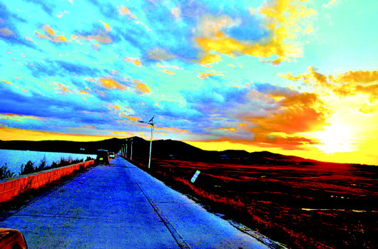 车行驶在蜿蜒的草原天路上,尽管弯道很多,上坡下坡多,但路上车辆不很多,道路非常畅通。虽然草原天路只是张北坝上的一条柏油公路,但海拔也有千米左右,深色柏油路与黄实线本身就是一条美丽的风景。百里之间,左右徘徊曲折,剧烈地跌宕起伏,静谧深远,仿佛通向梦的彼岸。